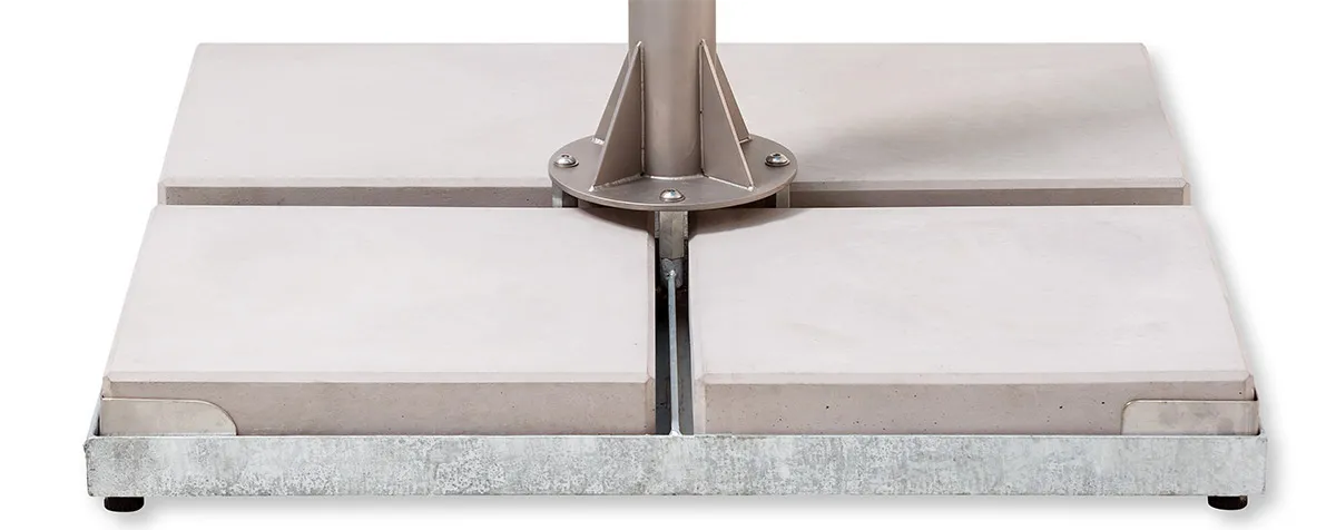 Designed for Cantilever Umbrellas, this heavy-duty base provides extra weight and support. Includes adjustable nylon feet or optional heavy-duty castor wheels for mobility. Compatible with bolt-on pole stands for easy mounting.